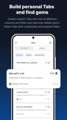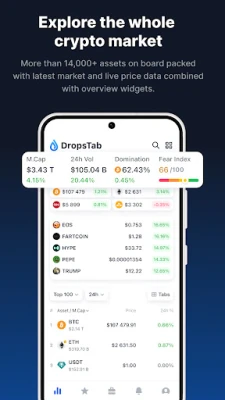 பயனர் அனுபவத்திற்கு முன்னுரிமை அளித்து வடிவமைக்கப்பட்ட DropsTab, நம்பகமான நாணய கண்காணிப்பு தளமாகச் செயல்படுகிறது. எளிமையான வழிசெலுத்தல், சரியான நேரத்தில் தரவு மற்றும் துல்லியமான தகவல்களுடன், உங்கள் கிரிப்டோ முதலீடுகளை எளிதாக நிர்வகிக்கலாம்; லாப நஷ்டங்களைக் கண்காணித்து, உங்கள் சொத்துக்களை திறம்பட கண்காணிக்கலாம். சந்தையின் ஒட்டுமொத்த நிலையை விரைவாக அறிய, பிடிசி ஆதிக்கம், ஈடிஹெச் குவெய், மொத்த சந்தை மதிப்பு மற்றும் 24 மணிநேர வர்த்தக அளவு போன்ற முக்கிய உலகளாவிய கிரிப்டோ புள்ளிவிவரங்களை டாப்பிலேயே காணலாம். எந்தவொரு கிரிப்டோவையும் அதன் பெயரை டைப் செய்வதன் மூலம் எளிதாகக் கண்டறியலாம் அல்லது மார்க்கெட் கேப், விலை மற்றும் குறிப்பிட்ட நேர பிரேம்கள் (1 மணிநேரம், 24 மணிநேரம், 7 நாட்கள்) மூலம் வரிசைப்படுத்தலாம். உங்களுக்குப் பிடித்தமான சொத்துக்களை உங்கள் கண்காணிப்புப் பட்டியலில் சேர்க்கும் வசதியும் இதில் உள்ளது.