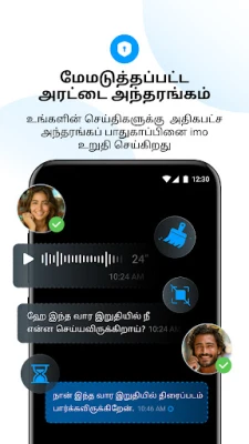 உங்கள் தனிப்பட்ட தகவலின் பாதுகாப்பு imo-வின் முதன்மையான முன்னுரிமை. எண்ட்-டு-எண்ட் என்க்ரிப்ஷன் மூலம் உங்கள் உரையாடல்கள் பாதுகாக்கப்பட்டிருப்பதுடன், டைம் மெஷின், மறையும் செய்திகள், தனிப்பட்ட அரட்டை மற்றும் ஸ்கிரீன் ஷீல்ட் போன்ற அம்சங்கள் உங்கள் அந்தரங்கத்தை மேலும் வலுப்படுத்துகின்றன. செய்திகளை நீக்கும் வசதி, ஸ்கிரீன்ஷாட் எடுப்பதைத் தடுக்கும் பாதுகாப்பு மற்றும் பதிவிறக்கம் செய்ய முடியாத தனிப்பட்ட அரட்டை விருப்பங்கள் ஆகியவை உங்கள் கட்டுக்குள் உள்ளன. மொழியியல் தடைகளைக் கடந்து, உலகின் எந்த மூலையில் உள்ளவருடனும் சிரமமின்றிப் பேச imo-வின் உடனடி செய்தி மொழிபெயர்ப்பு அம்சம் துணைபுரிகிறது. மேலும், VoiceClub மூலம் ஒரே இடத்தில் கூடி, பொதுவான ஆர்வங்களைப் பகிர்ந்து கொள்ளுங்கள். அங்கு நீங்கள் அறைகளை உருவாக்கி, நிகழ்ச்சிகளை நடத்தலாம், திறமைகளைக் காட்சிப்படுத்தலாம் அல்லது சும்மா அரட்டையடித்து மகிழலாம். imo உங்கள் தகவல் தொடர்பைப் பாதுகாப்பானதாகவும், திறமையாகவும், மகிழ்ச்சியானதாகவும் ஆக்குகிறது.