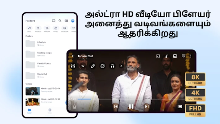 Amazon MX Player உடன் இணையற்ற காணொளி அனுபவத்திற்குள் அடியெடுத்து வையுங்கள். எங்களின் அதிநவீன ஹைப்ரிட் ஹார்டுவேர் ஆக்சிலரேஷன் தொழில்நுட்பம், உங்கள் 8K மற்றும் 4K அல்ட்ரா HD காணொளிகளை எந்தத் தடையுமின்றி மென்மையாய் இயங்கச் செய்கிறது. உங்கள் சாதனத்தின் மல்டி-கோர் சிப்செட்டின் முழுத் திறனையும் பயன்படுத்தி, 70% வரை டிகோடிங் திறனை மேம்படுத்துவதன் மூலம், Amazon MX Player நிகரற்ற செயல்திறனை உறுதி செய்கிறது. எளிமையான சைகைகள் மூலம் ஒலி அளவு, திரை வெளிச்சம், காணொளி தேடுதல், பிளேபேக் வேகம் மற்றும் வசனங்களை எளிதாகக் கட்டுப்படுத்துங்கள். மிதக்கும் சாளரம் மற்றும் பிக்சர்-இன்-பிக்சர் (PiP) வசதியுடன், நீங்கள் வேறு பணிகளைச் செய்யும்போதும் உங்களுக்குப் பிடித்த நிகழ்ச்சிகளை ஒரு கணமும் தவறவிடாமல் பார்த்து மகிழலாம். உங்கள் விருப்பத்திற்கேற்ப பயனர் இடைமுகத்தையும், இயக்கக் கட்டுப்பாடுகளையும் தனிப்பயனாக்கி, உங்கள் பார்வை அனுபவத்தை முழுமையாக்குங்கள்.